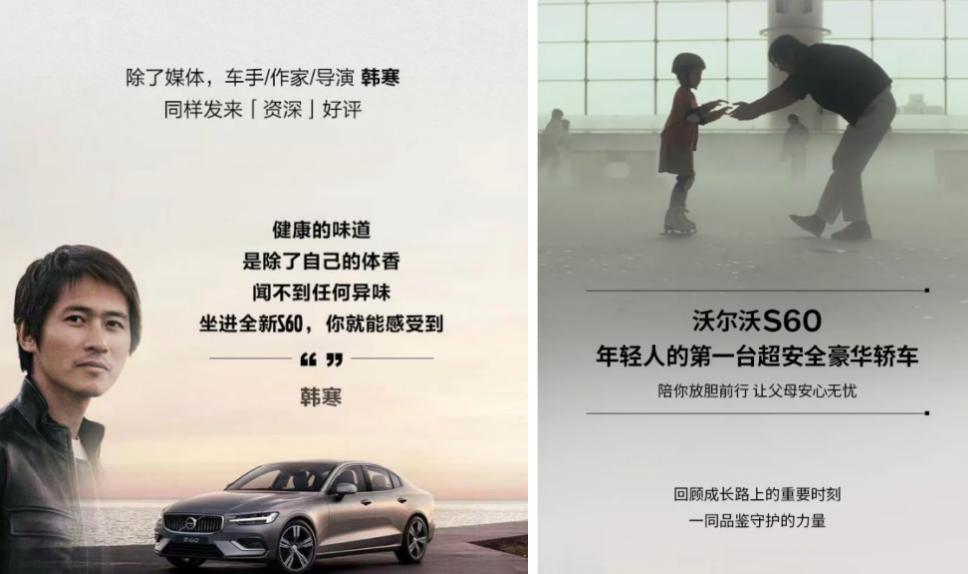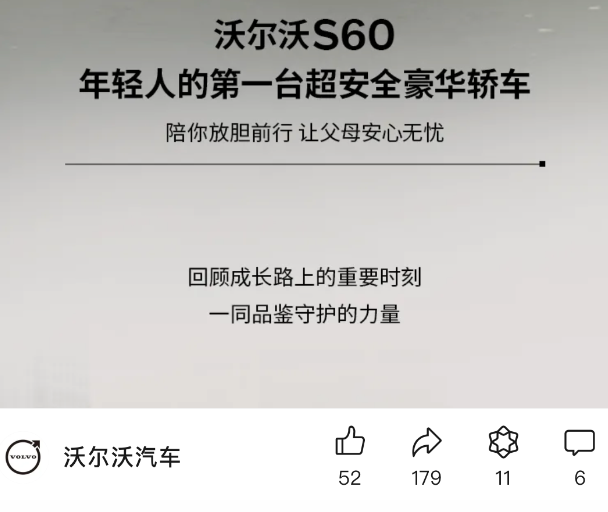 针对不同用户,这辆车的广告投放标题也不一样,在面向年轻群体时,将S60称为“年轻人的第一台超安全豪华轿车”;在面向家庭用户时,沃尔沃部分线上渠道投放广告时将S60称为“家庭出行的第一辆车”。