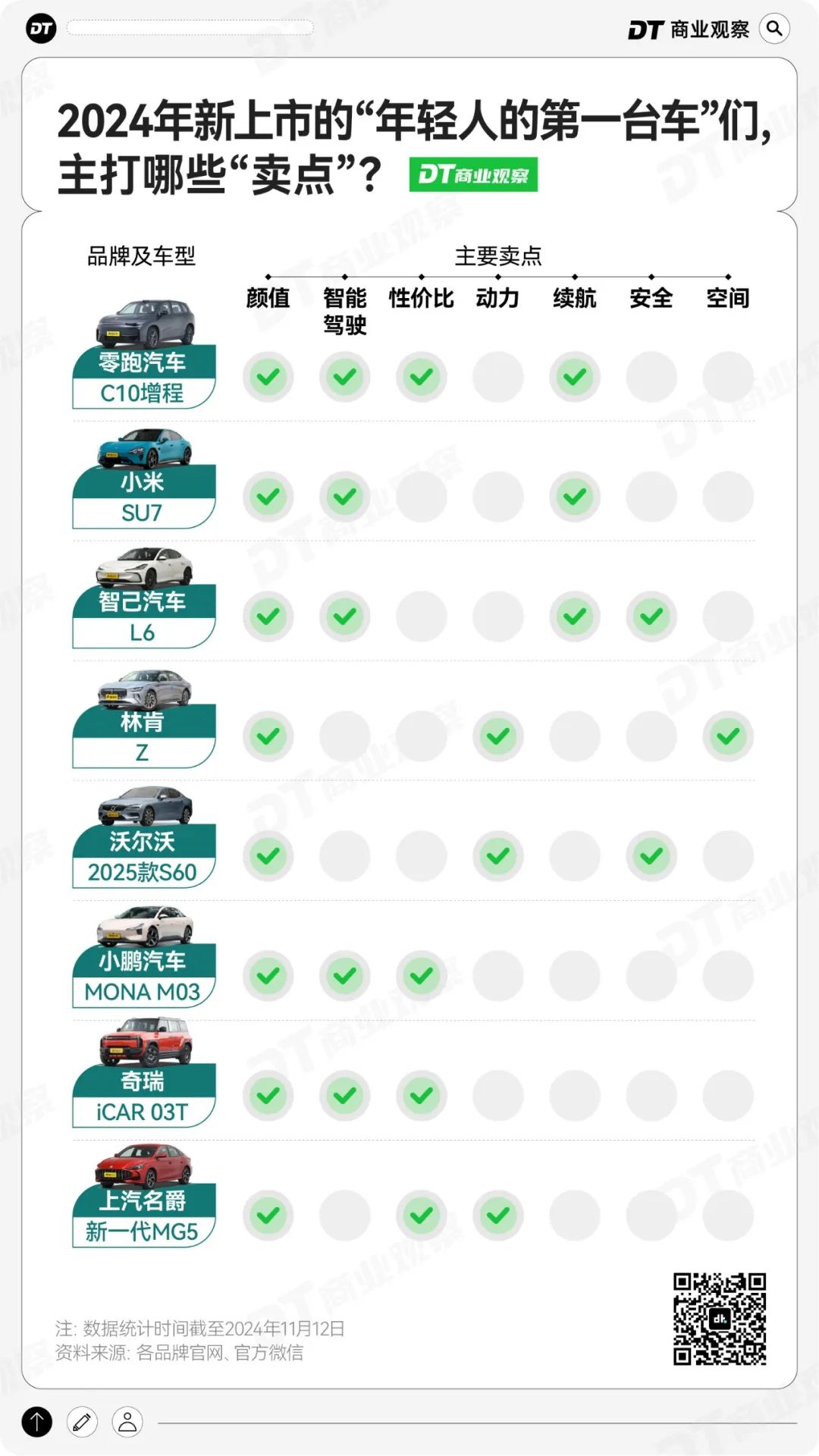 以2024年至今上市的各个品牌为例,“年轻人第一台车”标签下的相关车型,虽然价格不一,性能也各有千秋,但是整体上“年轻人的第一台车”的宣传点TOP3可以总结为:颜值、性价比、智能驾驶。
