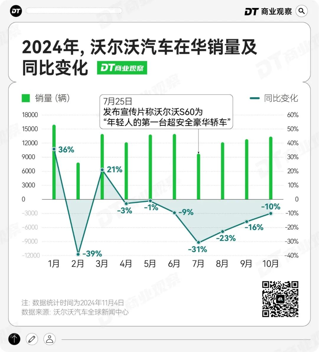 今年7月,沃尔沃汽车在其官方微信发布《让自己放胆,让家人放心》宣传片,把目标客群对准年轻人和年轻人的父母后,沃尔沃在中国市场的销量和去年同期相比仍在下滑,8月、9月、10月销量分别同比下滑23%、16%和10%。