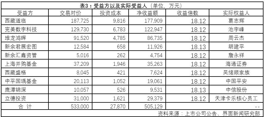 另外,周云杰控制上市公司奥瑞金,并通过奥瑞金参与本次交易;胡建平通过上市公司电魂网络持有新余君展宏图32.86%单一最大权益;詹永祥是新余汇鑫资管最大单一合伙人份额持有人;海通证券通过上海并购基金的普通合伙人(GP)以及有限合伙人海通开元投资实际持有33.68%的权益;中信股份持有鹰潭锦深99.99%权益。
