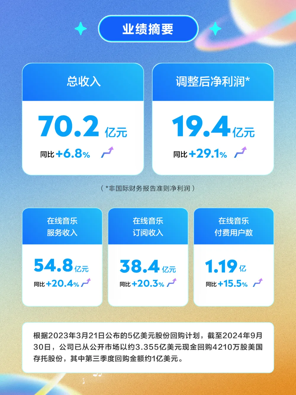 11月12日,腾讯音乐公布2024年第三季度的财务报告。报告显示,该季度公司总收入达到70.2亿元人民币,较去年同期增长6.8%;调整后的净利润为19.4亿元人民币,同比大幅增长29.1%。