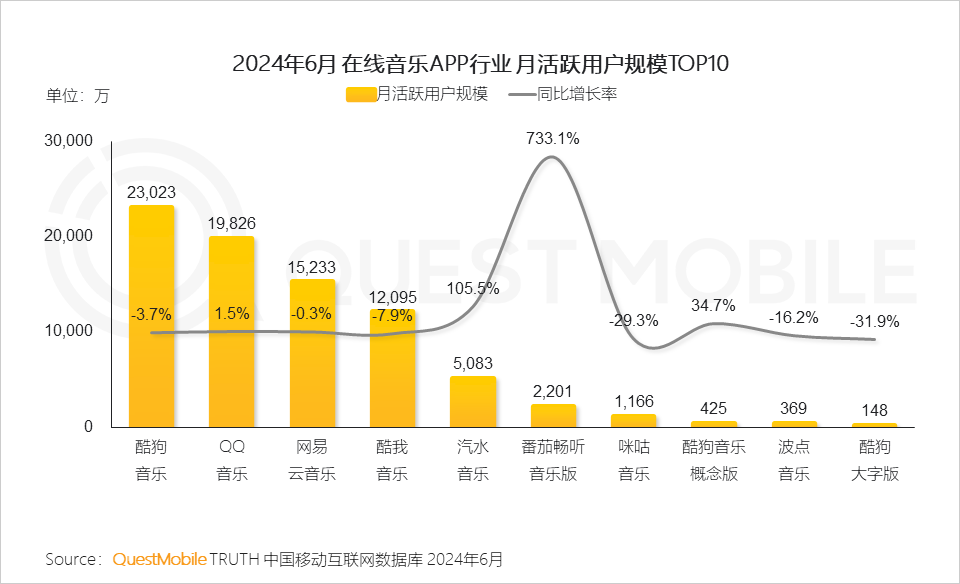 不过,酷狗音乐的月活要更高一些。根据QuestMobile的数据,截至2024年6月,酷狗音乐以23023万的月活跃用户规模稳居在线音乐APP行业第一名。
