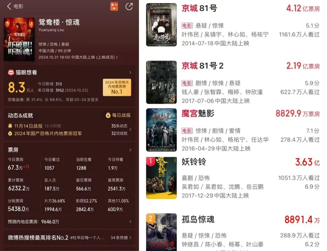 猫眼专业版预测《鸳鸯楼·惊魂》的总票房将达到1.2亿,或将超过杨幂的《孤岛惊魂》,成为国产恐怖片史上的第五名,仅次于吴君如的《妖铃铃》、林心如的《魔宫魅影》以及两部《京城81号》。