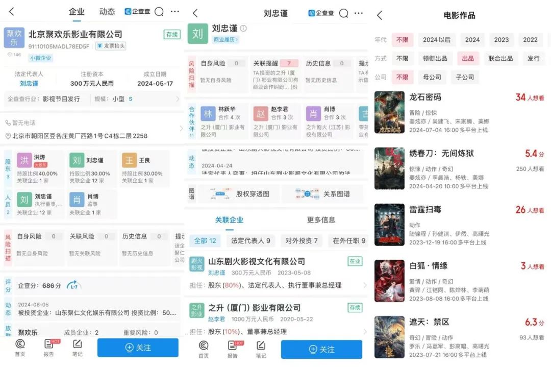 《鸳鸯楼·惊魂》备案与主出品方为聚欢乐影业。聚欢乐影业是没有参与过什么作品,但其大股东刘忠谨参股的名为“之升影业”的几个子公司,参与过很多电影、电视剧的出品与发行。但主控项目多为网大和短剧,都没什么明星班底。