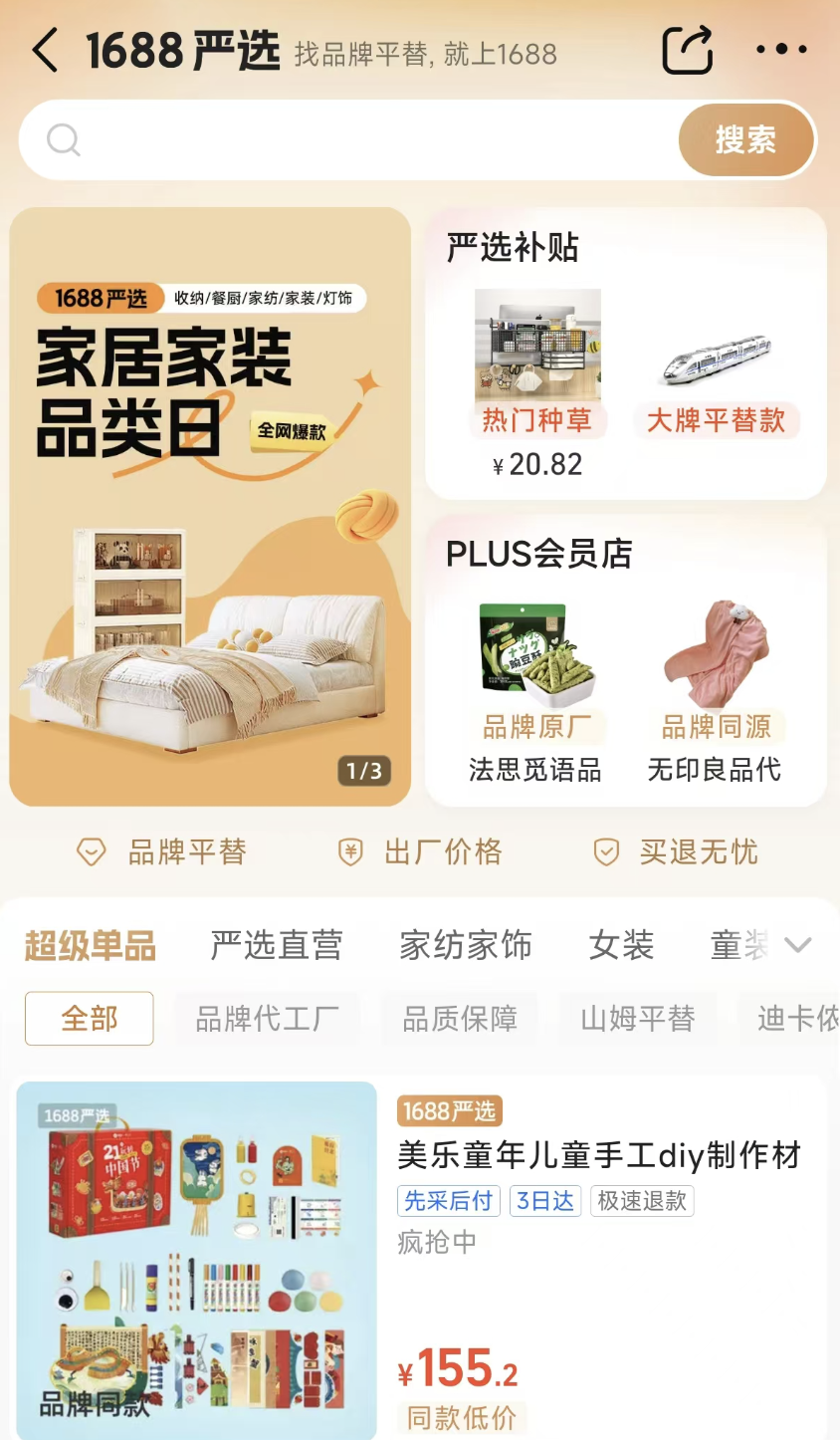 2022年9月,1688上线“1688严选”项目,主打“品牌平替”路线,总经理潘杰将其定位为“1688的天猫”。到2024年,1688严选进一步升级,成立独立公司“1688源选”,并开设“1688严选店”,做起了贴牌生意。