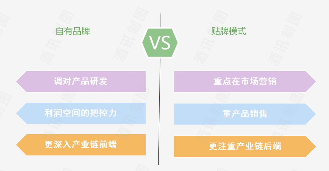 电商平台自有品牌与贴牌模式有相似之处,都是找制造商或供应商生产产品。但本质上又有差异——前者强调对产品研发、利润空间的把控力,更深入产业链前端;而后者的重心在市场营销、产品销售,更注重产业链后端。从模式的差异可以看到,在品控和定价权上,自有品牌的灵活性和主动权更高。