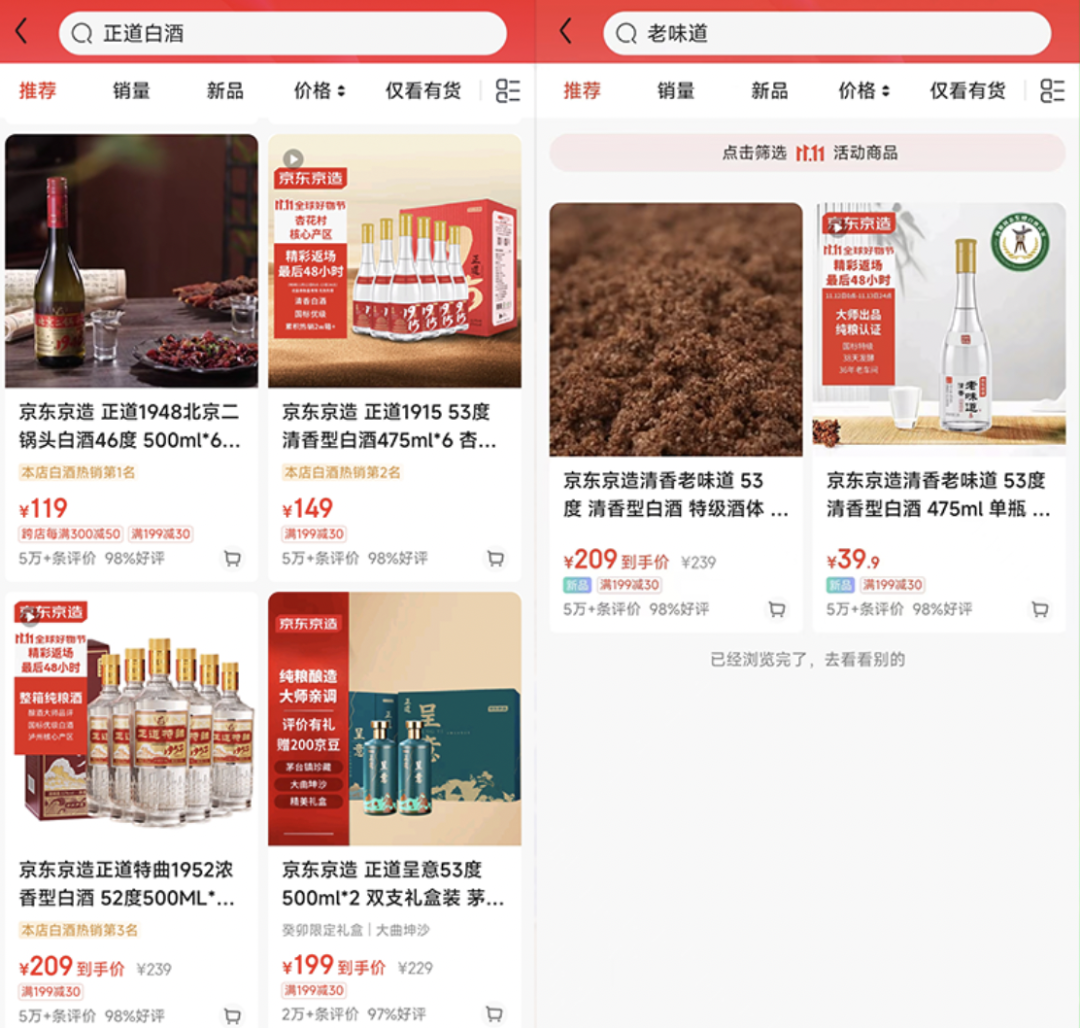 而在白酒领域,电商平台们早早展示过做自有品牌的野心。早在2022年,京东京造就曾先后联手黔国酒业、乾隆江南酒业推出过白酒产品“正道”,今年又联手汾阳王,推出“老味道”口粮酒;苏宁极物也曾联合贵州筑城酒业,推出了“筑城”白酒。