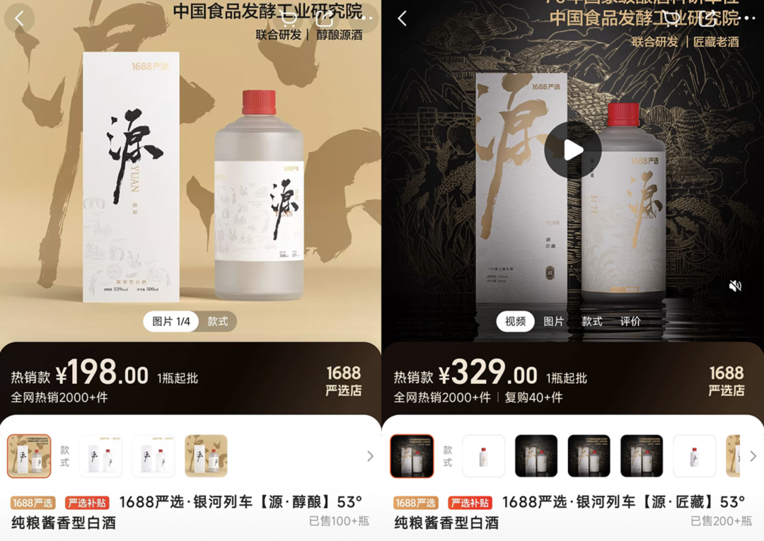 在其首批贴牌产品中,1688选择了白酒品类切入,首批推出了“源系列”两款产品,一款为售价329元/瓶的“源·匠藏”,另一款为售价198元/瓶的“源·醇酿”,均为500毫升53度酱香型白酒,上架于1688平台的“1688食品生鲜严选店”,两款产品的生产厂家不同,分别为贵州仁怀市红粮谷酒业有限公司和贵州贺天下酒业有限公司。