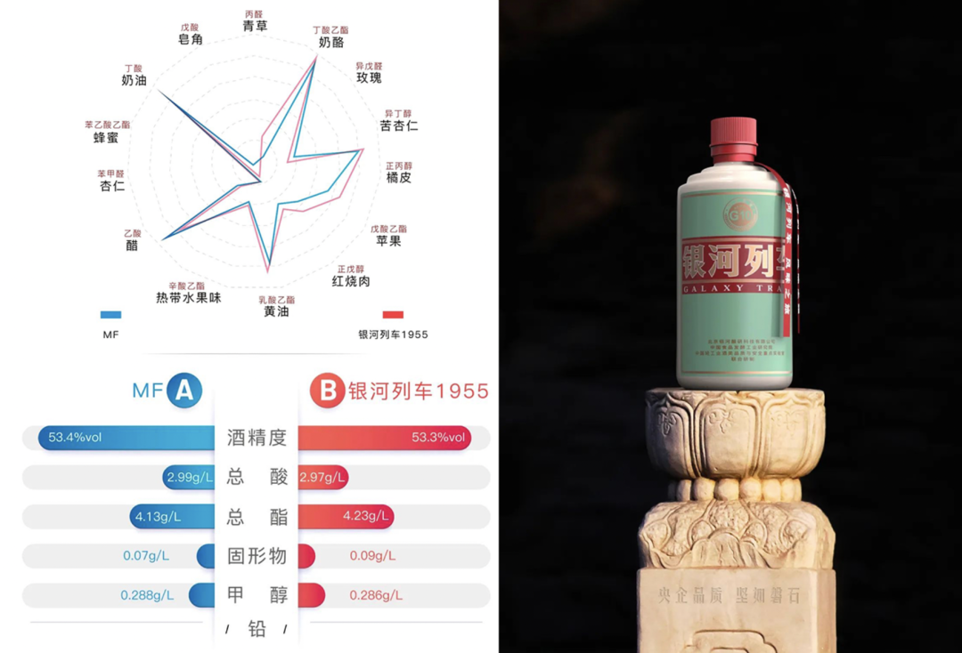 平替白酒的路,1688的合作伙伴已有经验。酒讯通过搜索发现,此次推出的两款产品隶属“银河列车”品牌,归属于北京银河酿研科技有限公司。2022年8月1日,该公司与中国食品发酵工业研究院联合成立了酒类联合研究中心,创立“银河列车”品牌,致力于做白酒风味研究。“银河列车”推出的第一款产品“银河列车·1955”主打“复刻飞天”,定位为“这个价位在市场上能找到最接近茅台风味的酒”。“源系列”显然也是延续了这一平替思路。