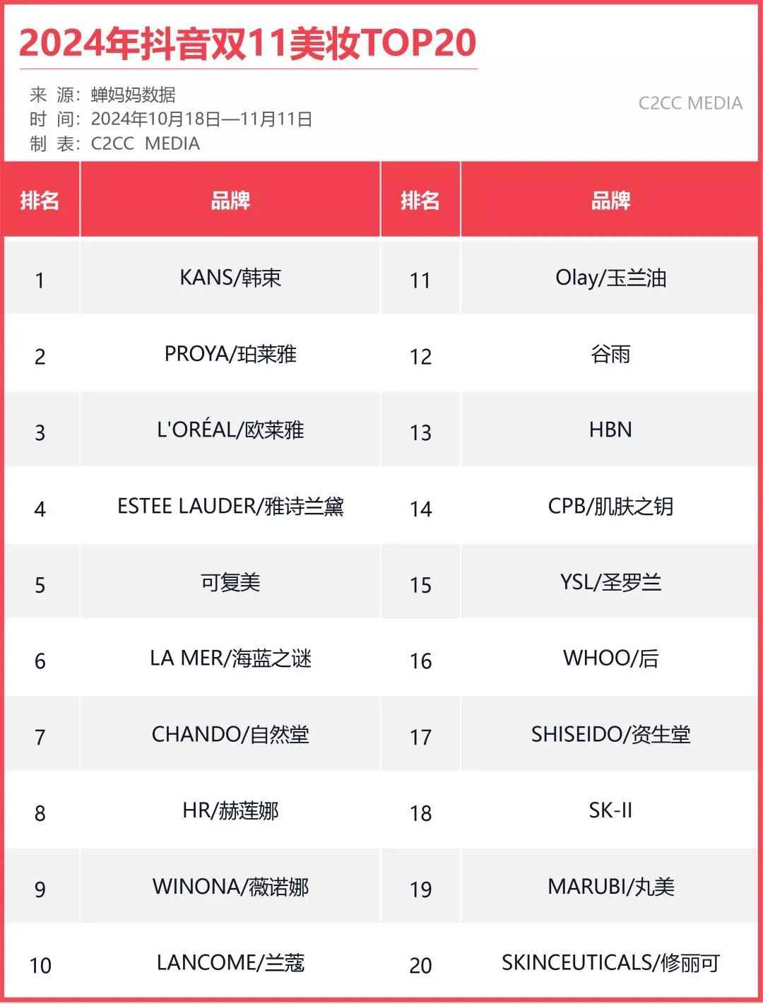 从刚刚结束不久的双11天猫、抖音两榜可以看出,韩妆品牌在中国市场的落寞是全面性的。今年“双11”美妆榜单TOP20国货、国际品牌平分秋色,已罕见韩妆品牌的身影,唯有韩国LG生活健康旗下的品牌THE WHOO占据抖音榜单TOP16。