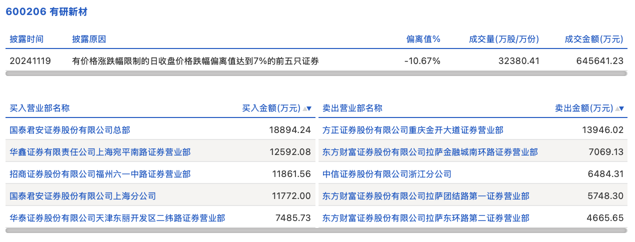 11月19日,有研新材今日跌停,龙虎榜数据显示,上榜营业部席位全天成交10.05亿元,占当日总成交金额比例为15.57%。其中,买入金额为6.26亿元,卖出金额为3.79亿元,合计净买入2.47亿元。