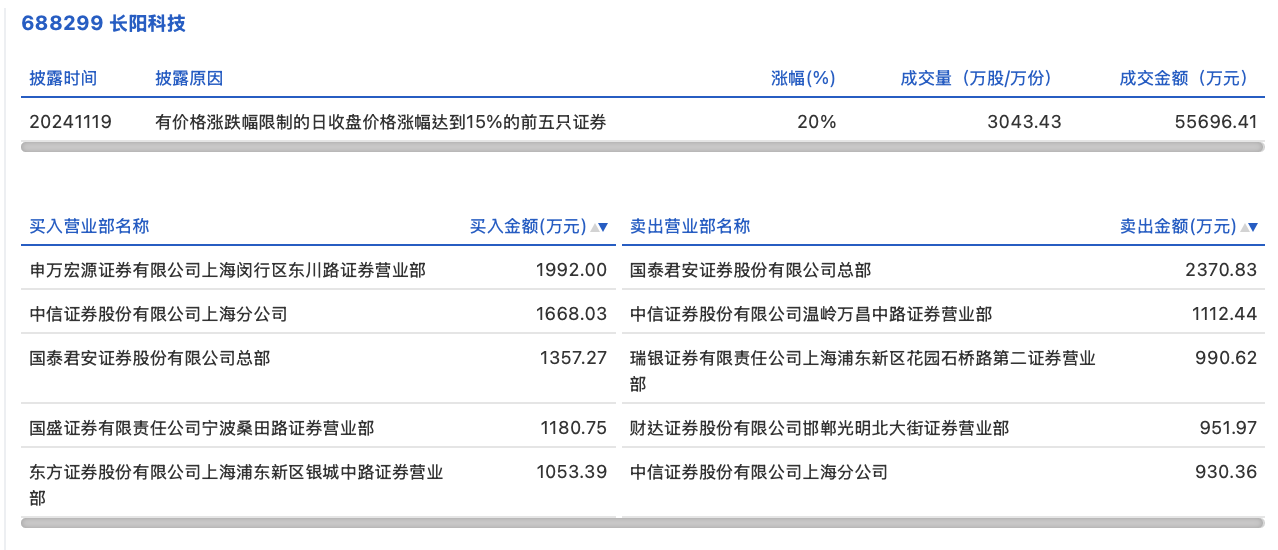 11月19日,长阳科技今日涨停,龙虎榜数据显示,上榜营业部席位全天成交1.36亿元,占当日总成交金额比例为24.43%。其中,买入金额为7251.44万元,卖出金额为6356.22万元,合计净买入895.22万元。