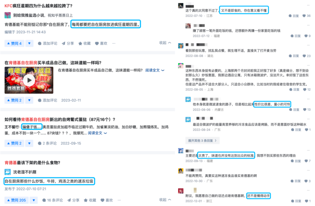 诸如“赚了顾客一笔外面吃饭的钱,还想额外再赚一份家里吃饭的钱”“就是微波速食的路子,但是相比起来性价比很差,量小的可怜”“真要买这种速冻食品谁买肯德基的啊”等网友吐槽说明,肯德基自主厨房产品既无性价比优势,又不能满足用户宅家时对便捷、即食产品的需求。