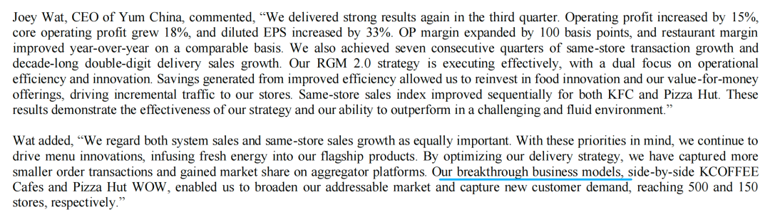 百胜中国首席执行官屈翠容表示,“通过优化外卖战略,我们吸引了更多小额订单,并在外卖平台上赢得了更大的市场份额。突破性商业模式——与肯德基餐厅‘肩并肩’的肯悦咖啡和必胜客 WOW 门店,使我们能够进一步拓宽目标市场并满足更多顾客的需求。目前,这两种新店模式的门店数量分别达到 500家和150家。”