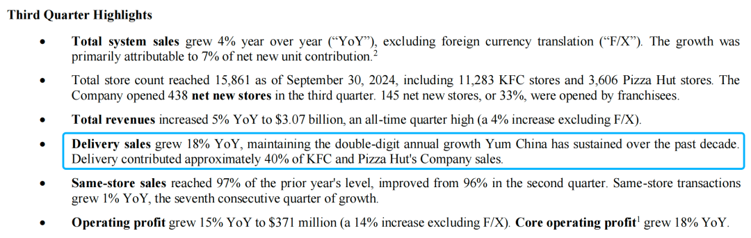 但对照百胜中国最新发布的2024年第三季度财报分析,不难发现,企业不再提及新零售与预制菜业务,而是将重点放在了外卖以及“突破性商业模式”上。