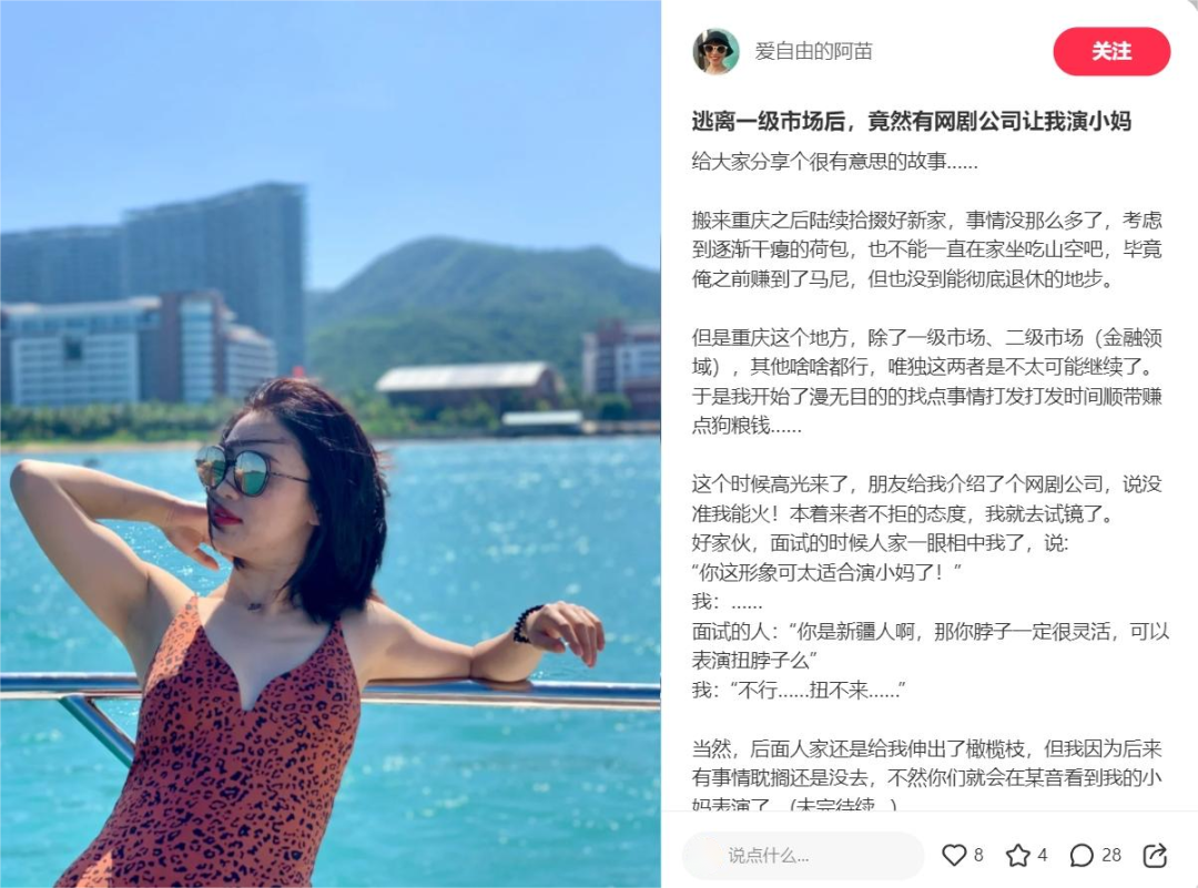 在上海金融行业打拼了10多年的新疆姑娘——阿苗,便是其中一员。在社交媒体上,阿苗描述自己处于人生的“过渡阶段”。从上海碾转到重庆,从金融公司合伙人到卖场打工人,从年薪百万到月薪2000元,我们好奇她生活巨大落差背后的故事和原因,也好奇着她当下的状态。