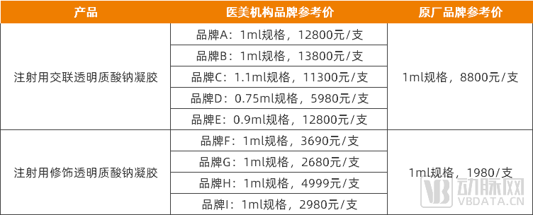 部分定制品牌玻尿酸与原厂品牌的价格情况(仅供整体情况参考,同一品牌产品在不同城市价格可能有差异),资料来源:企业公开信息、新氧APP