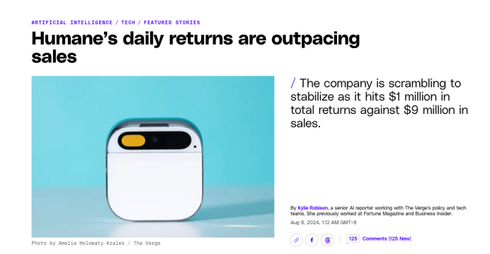 以AI Pin为例,这款被《时代》评为2023年最佳发明的产品,在短短4个月内就遭遇滑铁卢。据内部数据显示,5-8月期间退货量竟超过了购买量,截至8月,其900万美元的销售额中,退货金额就高达100万美元。