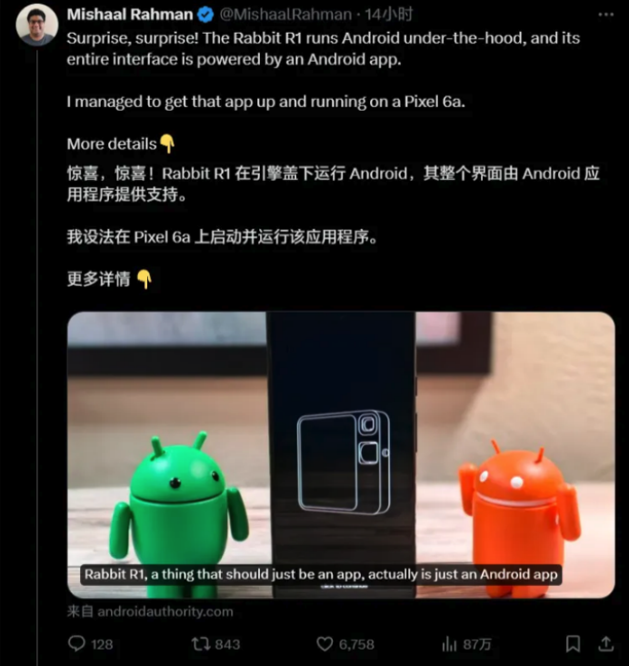 Rabbit R1更尴尬。在CES 2024上收获一片赞誉后,它很快就被技术社区扒到大翻车:系统本质是基于开源安卓定制、核心功能完全依赖GPT-3.5接口调用、其启动器APK甚至可以直接在普通安卓手机上运行。