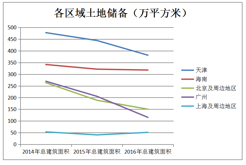 从总建筑面积的角度看,几大城市的土地储备除上海以外均有不同程度的下滑。其中,北京、广州地区土地储备与销售额双降的情况最为明显,北京与广州的土地储备分别由2014年的264万平方米与270万平方米跌至2016年的150万平方米与115万平方米。两者较2014年土储合计减少近一半。