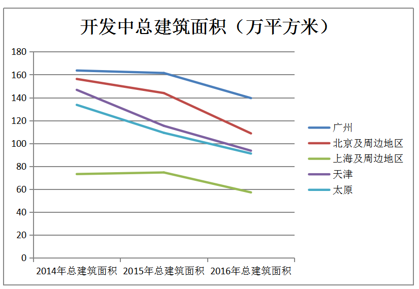 年底的各区域在建面积使这一趋势更为明显。各大核心城市的开工面积均呈现为逐年下滑。其中广州由2014年的12个项目减少至2016年的8个项目,开发中总建筑面积减少15%。而北京由2014年的7个项目减少至2016年的4个项目,开发中总建筑面积降低3成有余。