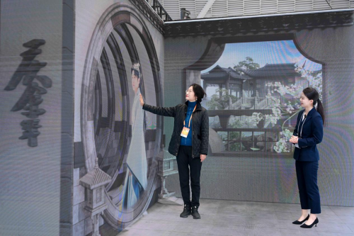 文化板块,是腾讯本次展会的一大亮点。在“腾讯文化IP盒子”中,集合腾讯文学、影视、音乐、游戏、电竞、动漫六大板块的文化产业集群跃然眼前。在以裸眼3D模式呈现的三面屏中,观众可以一览腾讯文化产业的全球布局,走入《庆余年》《繁花》等IP经典场景中进行合影,并通过现场设置的AI智能体,与剧中的虚拟角色实时语音互动。