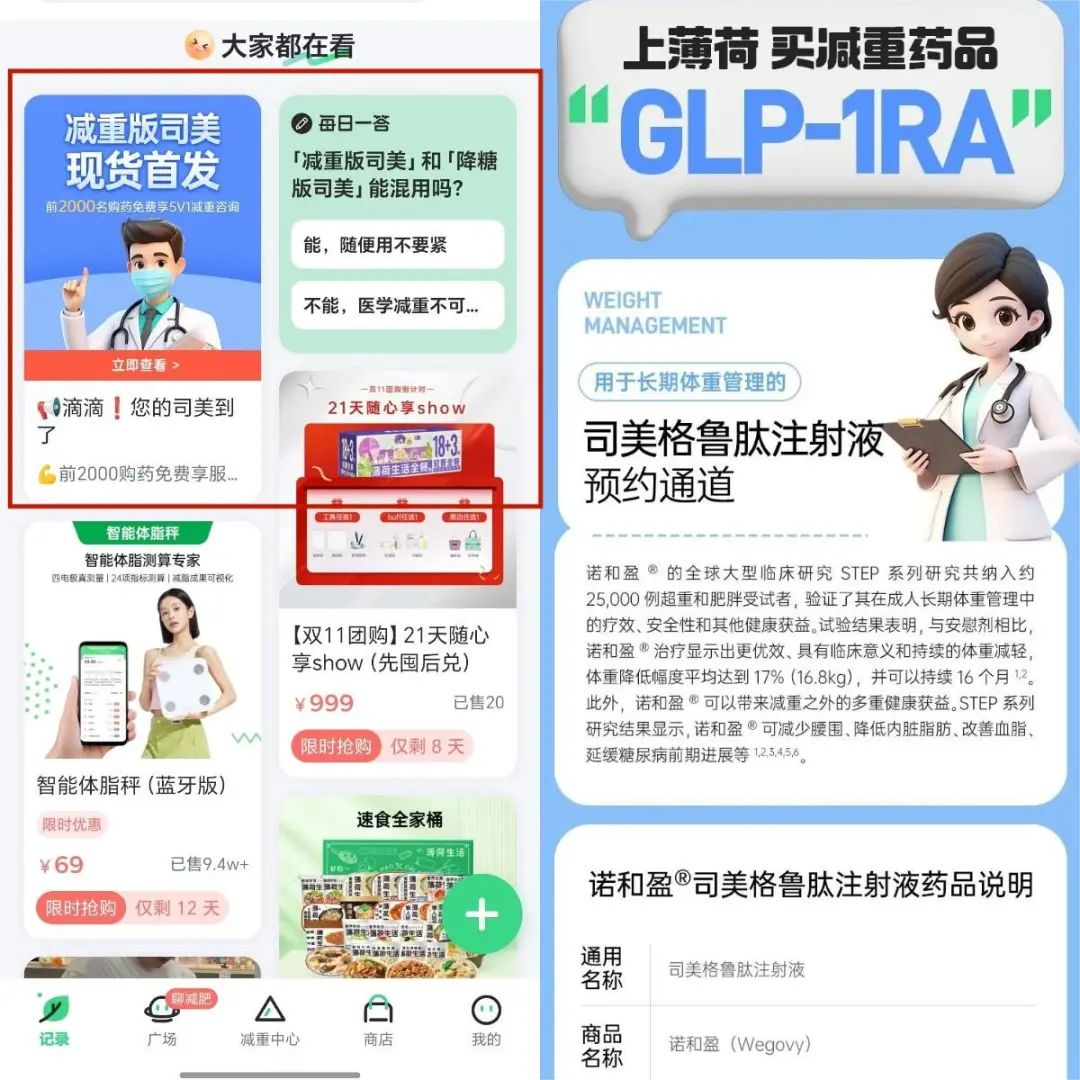 薄荷健康再次把重心放在减重。只是,在饮食与运动的常规方法之外,医疗辅助减重成为新欢。除了满足需要医疗手段的超重人群需求之外,这显然也迎合了当下年轻人不想吃苦又想减重的心理。司美格鲁肽的流行,更像是风口的信号灯。