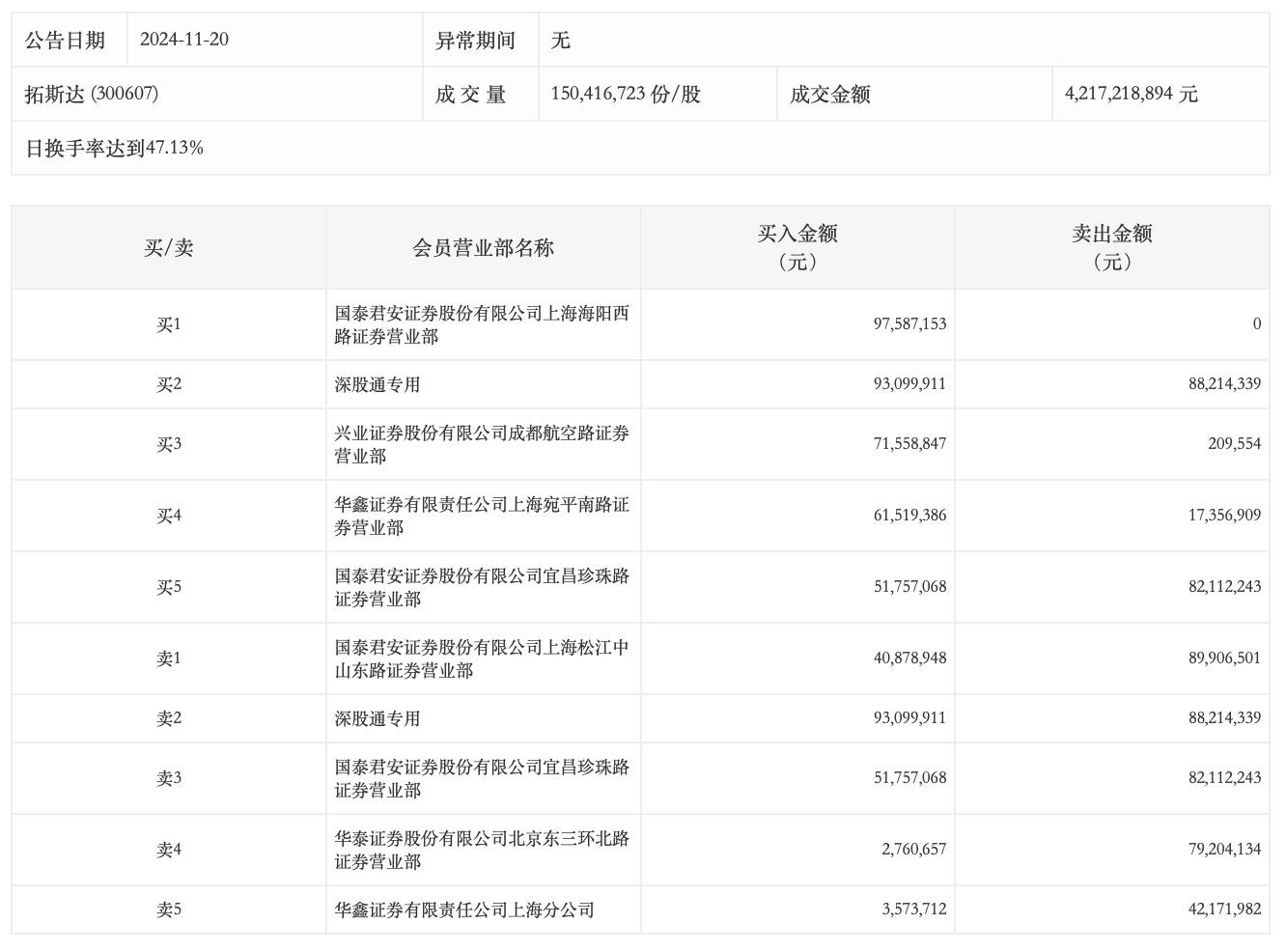11月20日,拓斯达今日涨停,龙虎榜数据显示,上榜营业部席位全天成交8.22亿元,占当日总成交金额比例为19.49%。其中,买入金额为4.23亿元,卖出金额为3.99亿元,合计净买入2356.0万元。