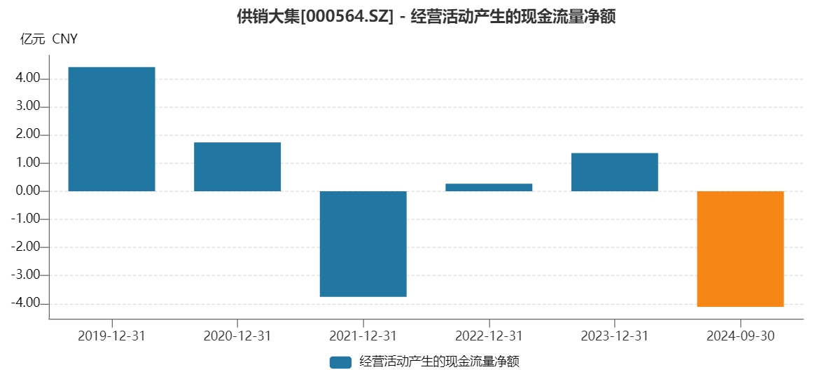 财报显示,经过重整,截至今年前三季度,供销大集账面上的货币资金余额17.5亿元,较此前明显充裕;不过,公司流动负债仍有41.76亿元。同时,公司经营活动现金流量为净流出4.11亿元,较上年末流出增加5.47亿元。