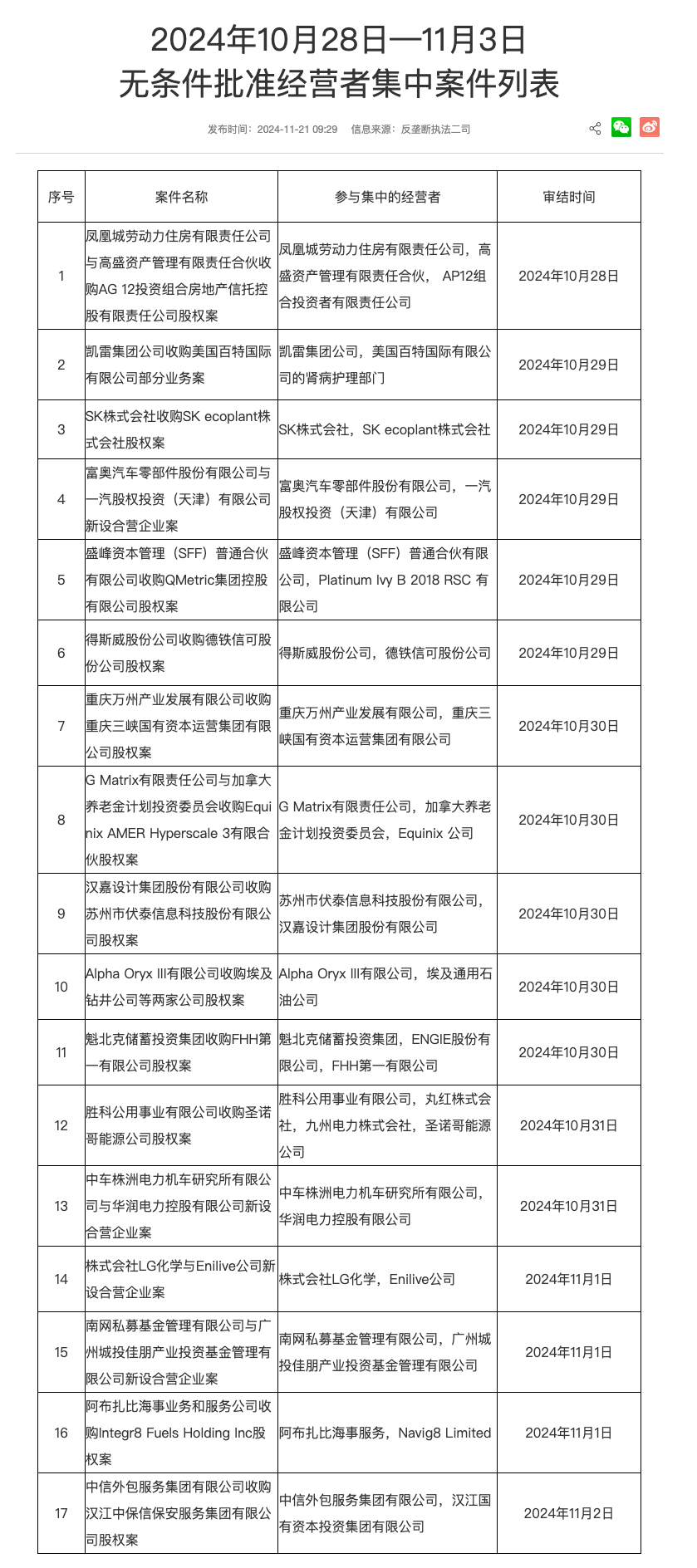 11月21日,市场监管总局发布10月28日-11月3日无条件批准经营者集中案件列表,其中包括凤凰城劳动力住房有限责任公司与高盛资产管理有限责任合伙收购AG 12投资组合房地产信托控股有限责任公司股权案、富奥汽车零部件股份有限公司与一汽股权投资(天津)有限公司新设合营企业案、中车株洲电力机车研究所有限公司与华润电力控股有限公司新设合营企业案等。
