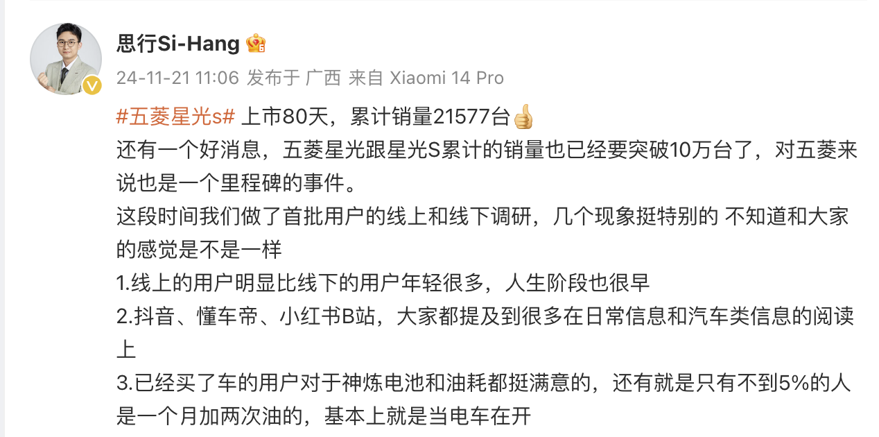 11月21日,五菱品牌与市场总监思行在微博发文透露,五菱星光S上市80天,累计销量21577台。此外,五菱星光和星光S累计销量将超过10万台。