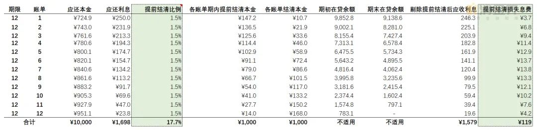 (2)各账单期内提前结清本金及损失息费;在提前结清比例确认的前提下,我们可以据此计算出各账单期内提前结清本金(具体计算过程可以参考下表3),确认期初、期末在贷余额,并进一步计算出对应各账单期内因提前结清而损失的息费。