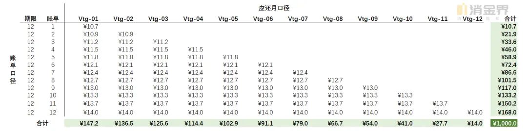 (1)各账单期内提前结清的比例;因为我们在前文参数假设拟定了各账单期内累计提前结清比例按照等比数列均匀增加,故我们所要确定的仅是第一个账单期内提前结清比例,结合全周期提前结清本金这个目标值(1000元),通过单变量求解我们可以计算出第一个账单期内的提前结清比例,后续各账单期内累计提前结清比例乘以对应账单值即可(注意,表2所展示提前结清比例均为单个账单期内数值,非累计值)。