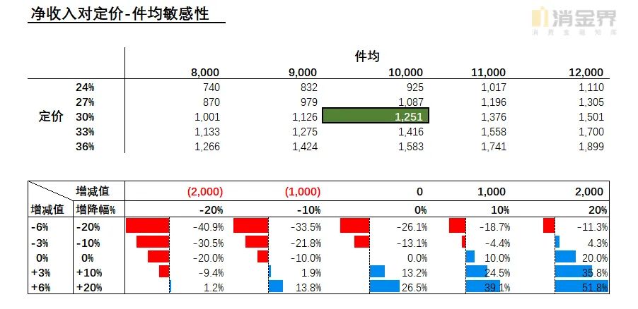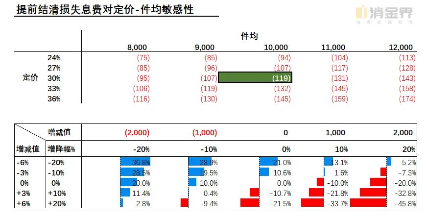 为了回答这个问题,我们将提前结清损失息费考虑在内,同样以定价-件均作为参数值,并取同等增减比例,测算净收入对定价-件均的敏感性,如下表6所示: