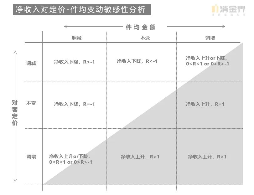 数据层面体现的更直接:降价&降件均对提前结清损失息费是最优策略,但对净收入确是最差的;提价&提件均对提前结清损失息费是最差的策略,但对净收入确是最优的;如果我们同样以R值来判断净收入对于定价-件均的敏感性与否,梳理后我们可以得到如下包含R值的“净收入对定价-件均变动敏感性分析”矩阵图,如下表7所示:
