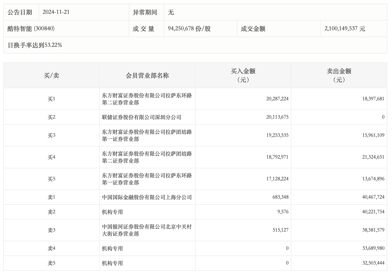 11月21日,酷特智能今日跌10.9%,成交额21亿元,换手率55.05%,盘后龙虎榜数据显示,三机构专用席位净卖出1.06亿元。