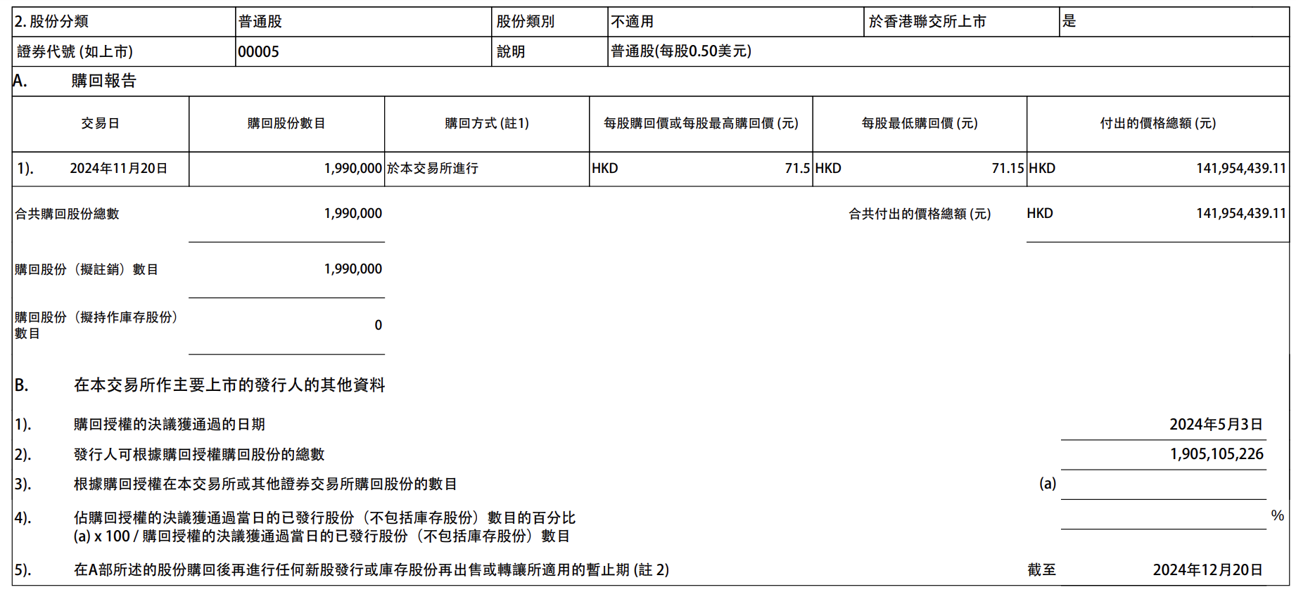 汇丰控股11月21日在港交所公告,11月20日斥资1.42亿港元回购199万股公司股份,每股回购价格71.15港元-71.5港元。