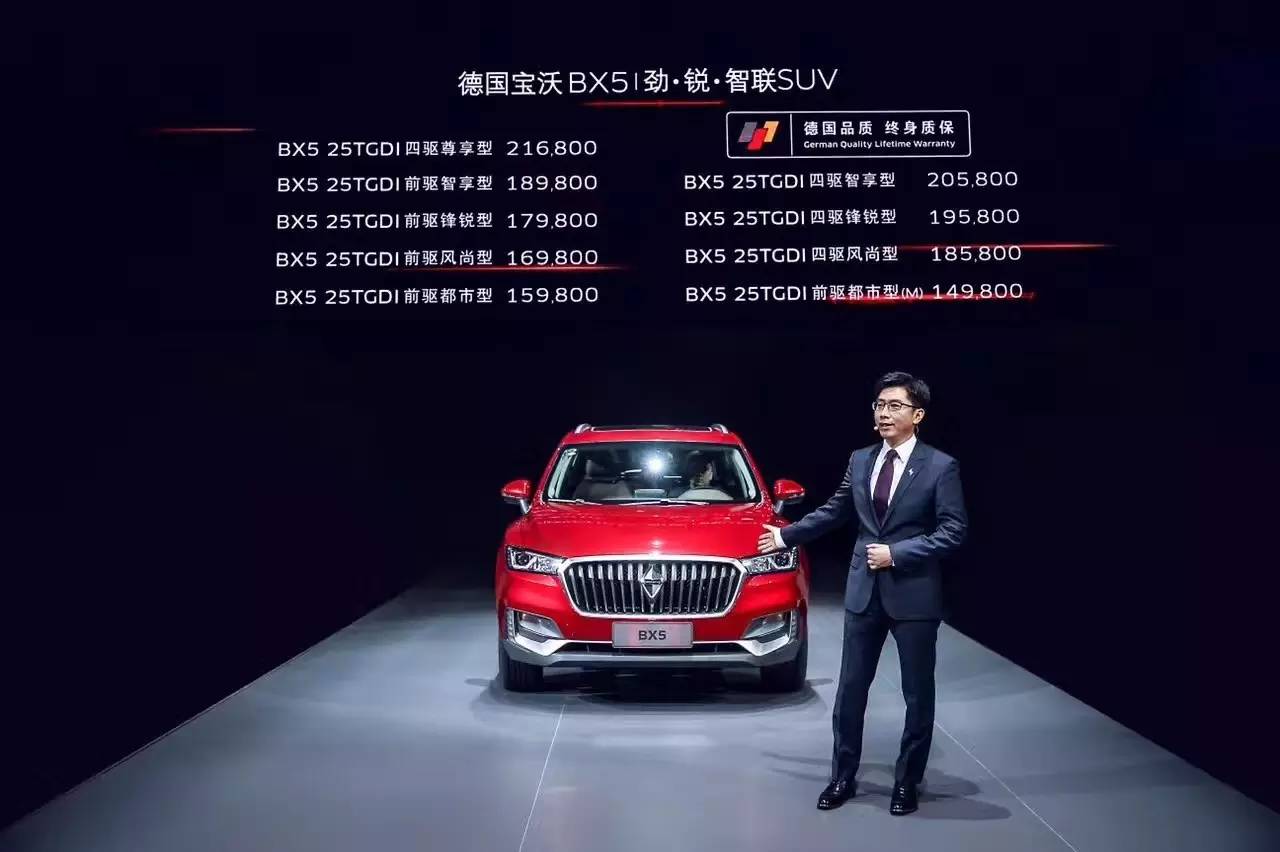 2017年3月24日,宝沃旗下的第二款SUV车型BX5正式上市,9款车型的售价为14.98—21.68万元,并推出了业内罕见的终身质保承诺。