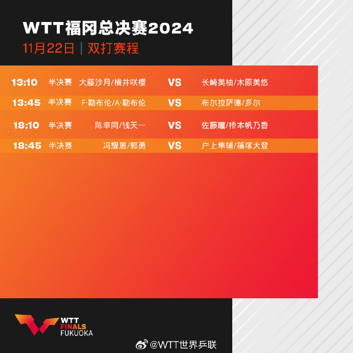 11月22日,WTT福冈总决赛继续进行。赛程如下: