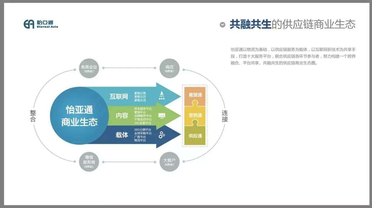 ◆做生态是信念还是“野心”:去年11月,怡亚通举办了一场盛大的商业新生态产品发布会,中国供应链服务的创始人、怡亚通董事长周国辉发布供应链+互联网的生态战略,全面推进O2O供应链(线上线下)融合,详细阐述了怡亚通要做的事情和要达成的目标,怡亚通强调生态是大家的,将建立商业新秩序,以改变中国流通业小、散、乱之现状。怡亚通做得事情无疑是震撼人心的,是推动中国商业变革的一股力量。