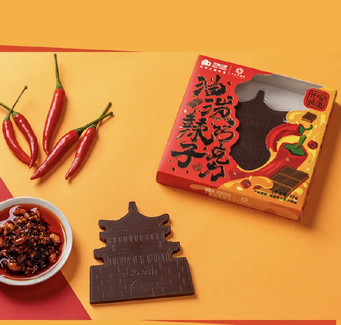 近期巧克巧蔻上新的一款油泼辣子巧克力,给行业带来了不小的震撼。这款甜辣混合巧克力采用“陕西味十足”的设计,甜口黑巧里融进油辣子,古城楼造型搭配满满的白芝麻粒,复现正宗“陕西风味”的同时,也传递出浓厚的“三秦文化”。
