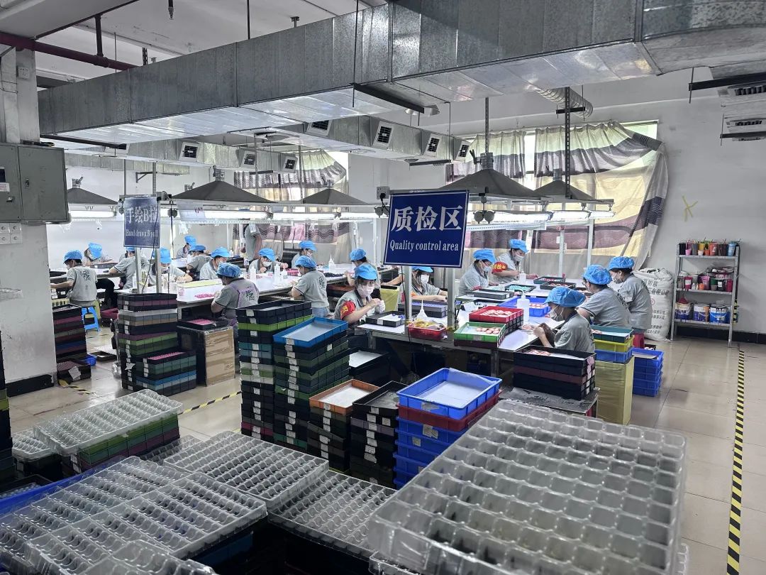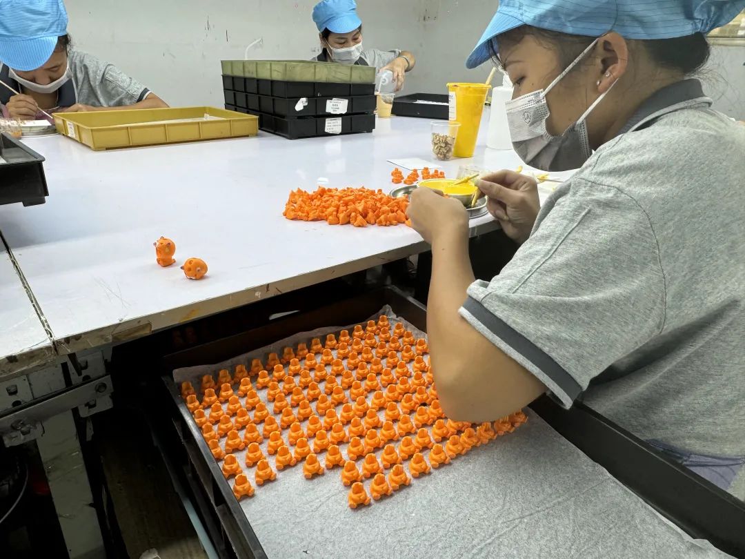 盲盒产品有其特殊属性,IP更迭快,制作要求高。一颗小小盲盒摆件,要经历数道工序——注塑成型、打磨抛光、喷大色、小枪喷油、移印、画油、组装、包装,每一步都需要人工参与。