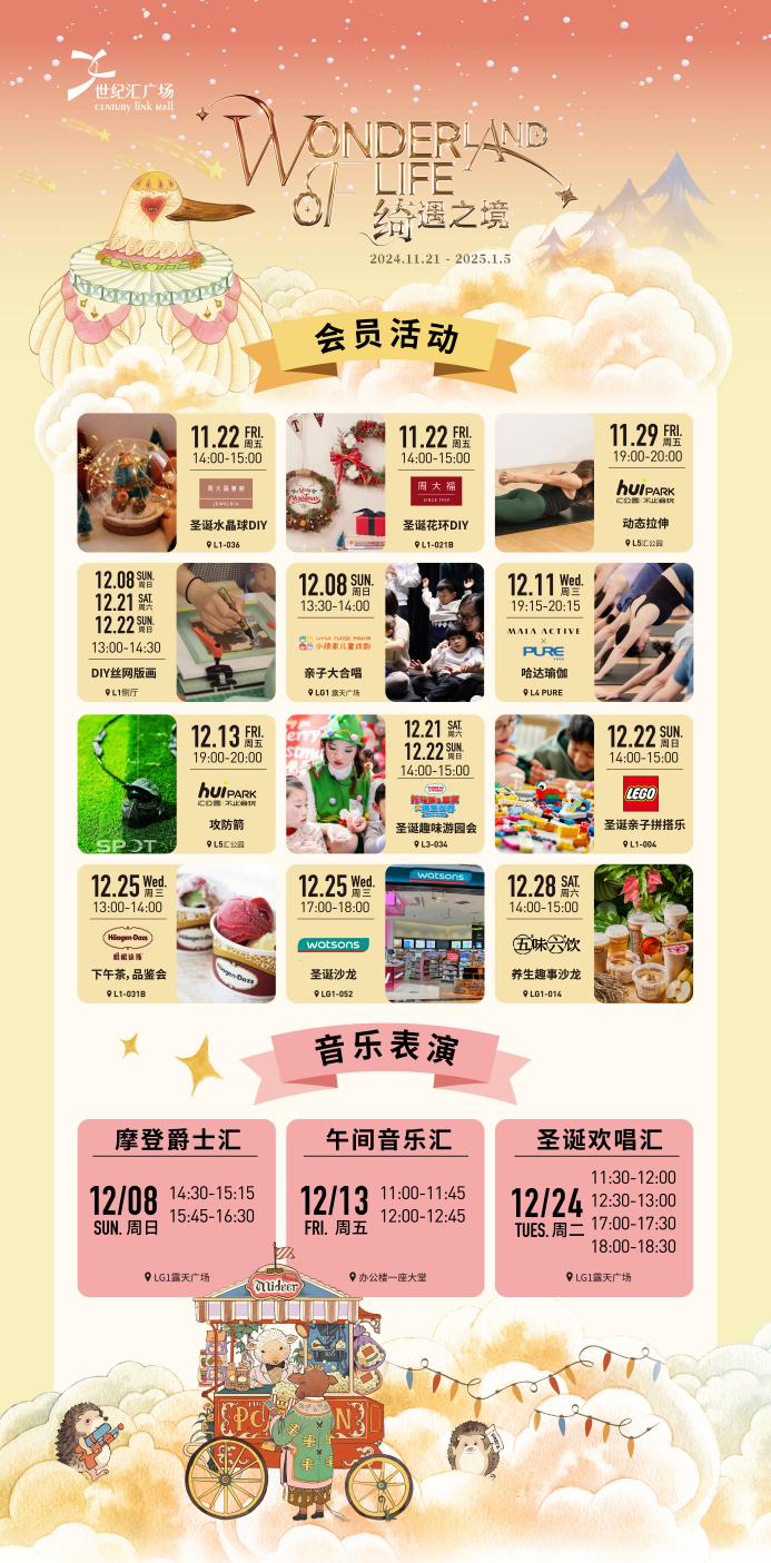 12月6日至8日,世纪汇联动全场品牌开启6周年庆促销活动,打造冬日消费狂欢,会员可享购物8倍积分、满额换礼、积分兑换等多重礼遇。12月21日起,不同档位的大众点评餐饮、零售团购礼券接档上线,会员另可享购物2倍积分。此外,“Fantasy Sound音乐汇”第四季也将于12月8日至12月24日期间再度开启,围绕节日主题带来乐队表演,以美妙乐声构筑冬日绮丽。