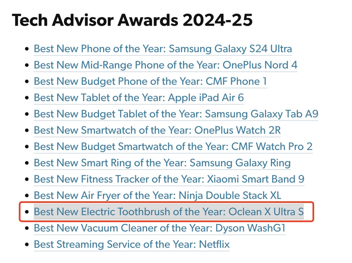 时值年末,全球各大科技媒体开始陆续颁发年度奖项,近日,备受瞩目的权威科技媒体Tech Advisor“2024-25年技术顾问奖”正式出炉,来自中国的数字化口腔健康品牌Oclean欧可林旗下明星产品——WiFi数字化AI牙刷Oclean X Ultra S(Oclean X Ultra套装),凭借极致创新的数字化健康体验,获评“年度最佳新款电动牙刷”。