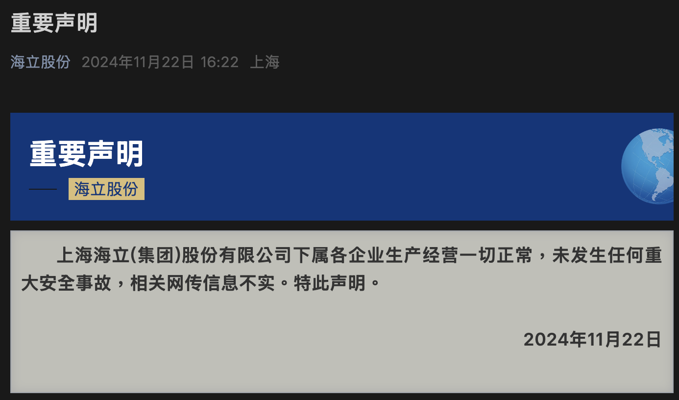 海立股份11月22日发布声明,上海海立(集团)股份有限公司下属各企业生产经营一切正常,未发生任何重大安全事故,相关网传信息不实。