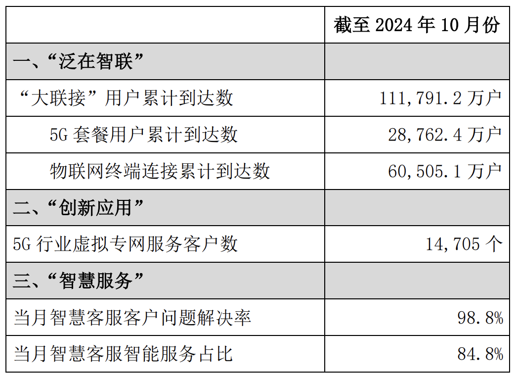 中国联通11月22日公告,截至2024年10月份“大联接”用户累计到达数11.18亿户,其中5G套餐用户累计到达数2.88亿户。