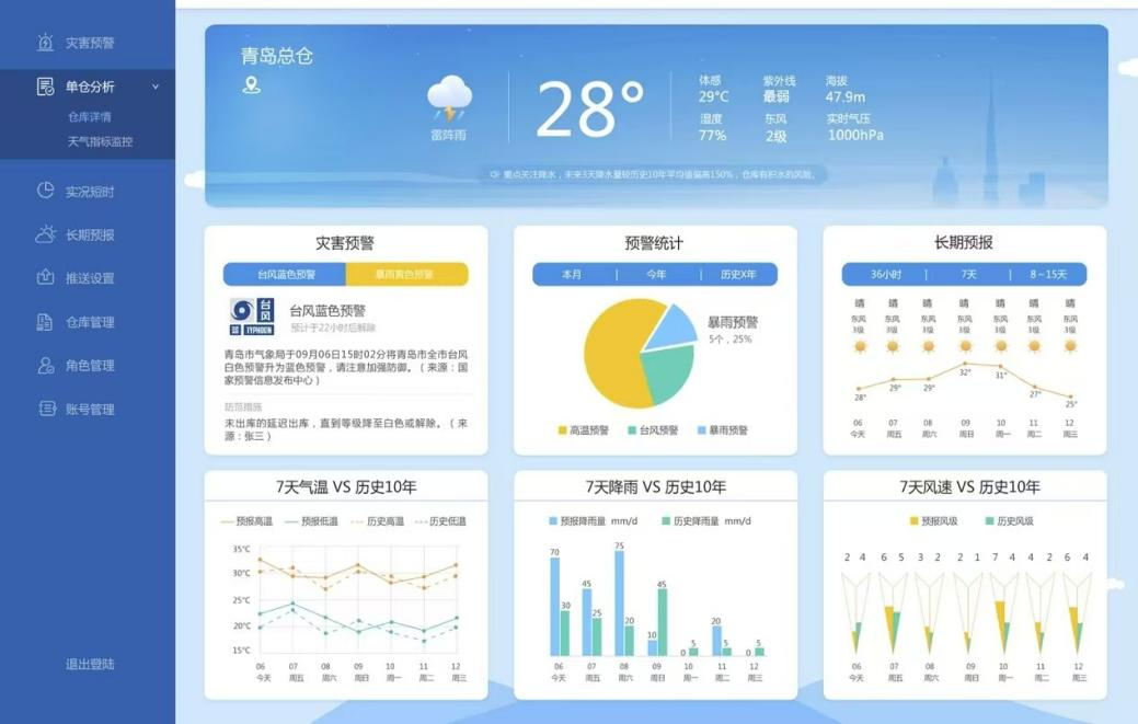 而为保障在途货物的安全,墨迹天气从仓储到运输,提供了一整套服务方案。在仓库选址阶段,可通过监测不同地区的年降水量、空气温湿度、风力、霜降期、年交通运营不利日数等变量,为物流企业仓库选址提供气象数据支持。在货物运输中,墨迹天气还提供了寒潮、雾、霾、道路结冰、霜冻等气象预警信息,同时,根据天气实况给出相应的建议措施,以确保物流运输平稳进行。