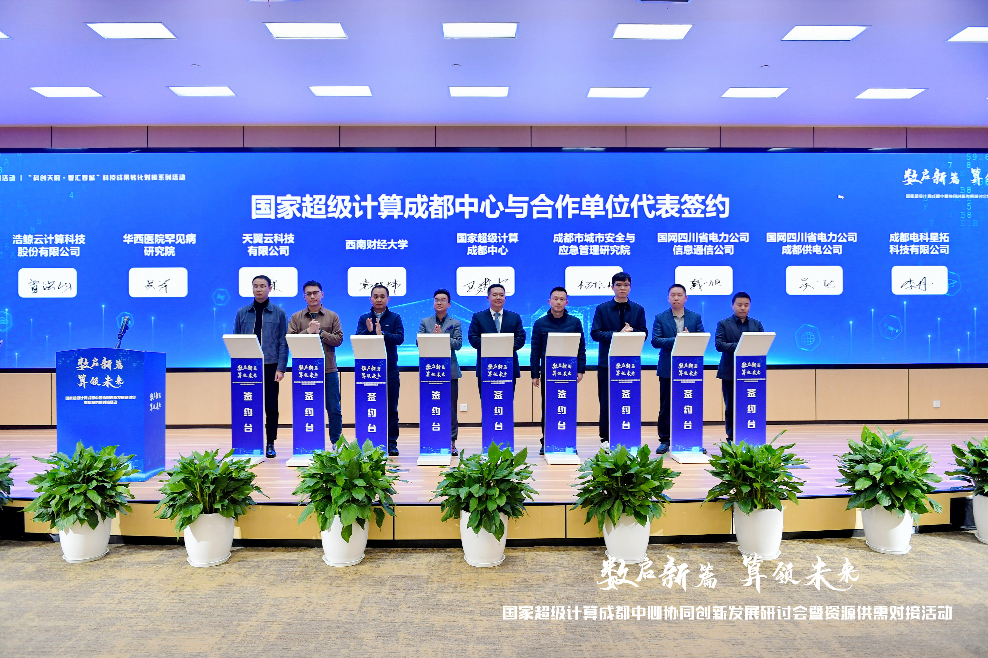 国家超算成都中心与合作单位代表签约。以项目为引擎,筑牢高质量发展“硬核支撑”。活动现场,作为成都市“六个一批”项目的国家超算成都中心与华西医院罕见病研究院、成都市城市安全与应急管理研究院、西南财经大学、成都电科星拓科技有限公司、电信天翼云、国网四川省电力公司成都供电公司共同举行了协同创新签约协议。未来,中心将联合生态伙伴,整合各方优势资源,在科研创新、人才培养、技术攻关等方面共同开展技术创新与产业升级的合作,推动科研成果向实际应用转化。
