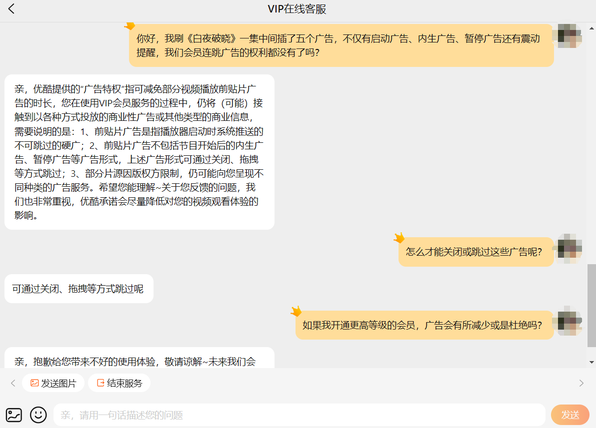 优酷客服告诉新识研究所,优酷提供的“广告特权”可减免部分“硬广”,但节目开始后的内生广告、暂停广告等只能通过关闭、拖拽等方式跳过,未来会持续不断优化完善的广告推送逻辑。