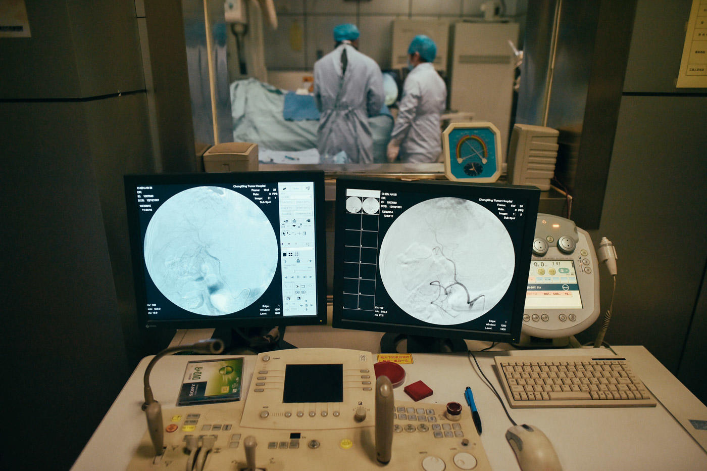介入手术室在首钢医院住院处的一层,门口标明辐射警示。推开沉重的金属大门,看到一条狭短的走廊,大门内侧有一个机器,把腿伸过去,打开启动按钮,会有塑料质地的鞋套伸出来,包裹着鞋,保证室内的无尘状态。经过护士办公室和一个会议室,最里面就是手术的操作间,一道抵挡辐射的金属门紧密。